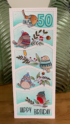 Ik gebruikte een slimline mal en kleurde de vakjes met distress inkt. Met dezelfde kleur en met witte verf heb ik wat gespetterd. De vogeltjes zijn allemaal lekker warm aangekleed, echte wintervogeltjes ;-)