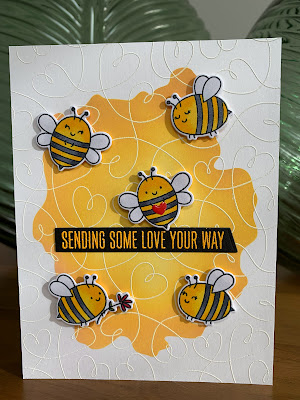 De huidige challenge bij de Dutch Card Lovers is het gebruiken van een resist techniek. Ik heb een achtergrondstempel met wit embossingpoeder gebruikt. Hierop met behulp van een stencil gedeeltelijk distress inkt aangebracht in verschillende kleurtjes geel. De leuke bijtjes van MFT komen liefde brengen!!