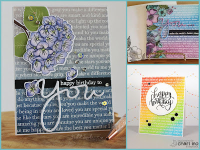 Lift deze werkwijze waarbij je de achtergrond maakt met TEKST d.m.v. (een) achtergrond stempel(s) zoals op de voorbeelden. Dat hoeft niet persé met embossingpoeder, maar wèl op een gekleurde achtergrond èn over de hele achtergrond. Dit moet de hoofdmoot zijn van je kaart. Het model is vrij, de afwerking geheel aan jou.